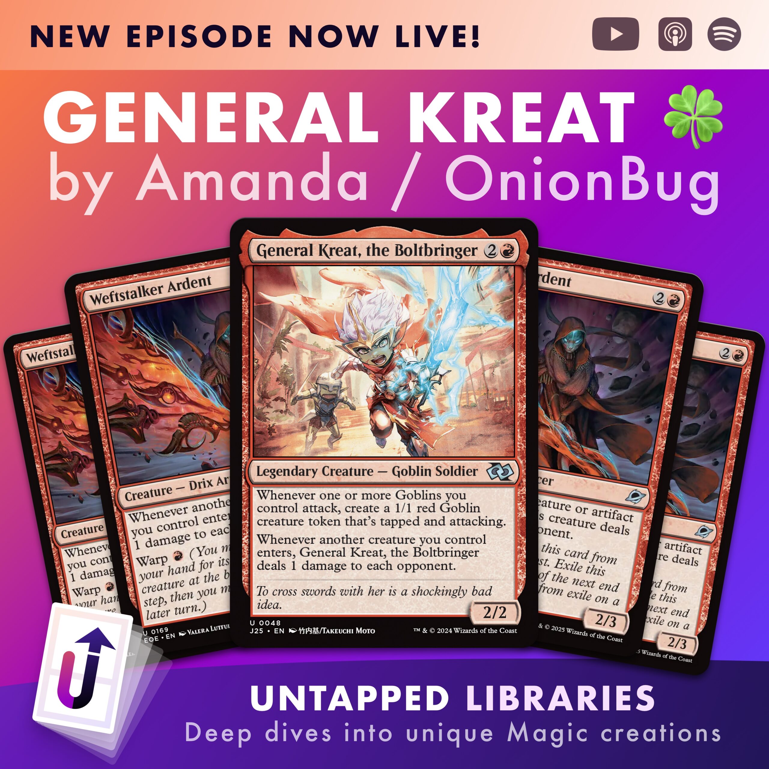 This episode we delve into the uncommons-only format, Clover, with its creator, OnionBug! OnionBug walks us through the format and her General Kreat deck. Neale and Vinny talk about building commander decks in all colour combos, being explosive and terrible on Arena, and quasi-Partners.