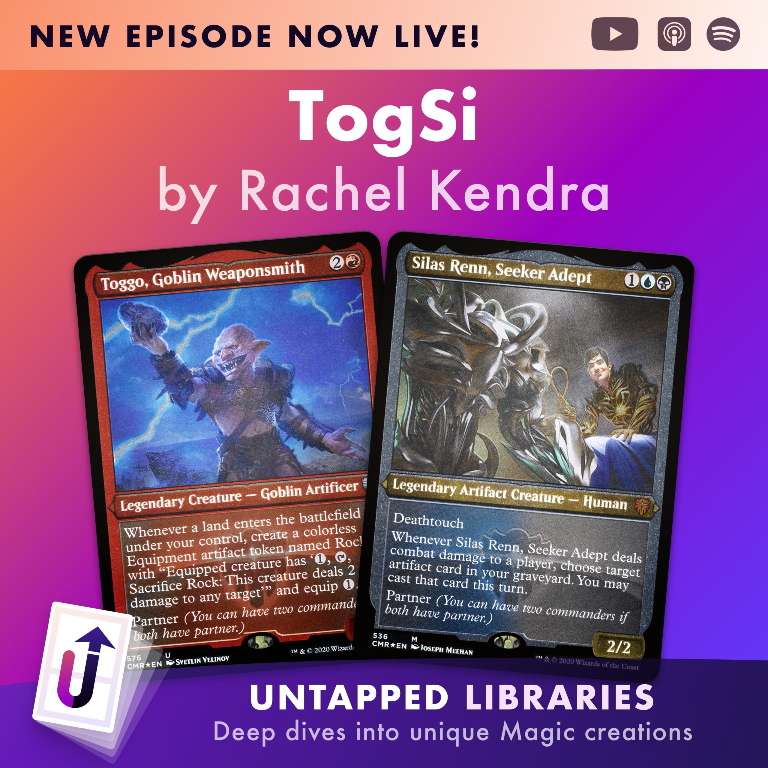 This week’s guest brings the rock. Rachel Kendra’s Toggo and Silas Renn commander deck generates a lot of artifacts to make a Grixis landfall-affinity deck. We also talk Norwegian sauna, naughty rabbits, and deckbuilding as storytelling.